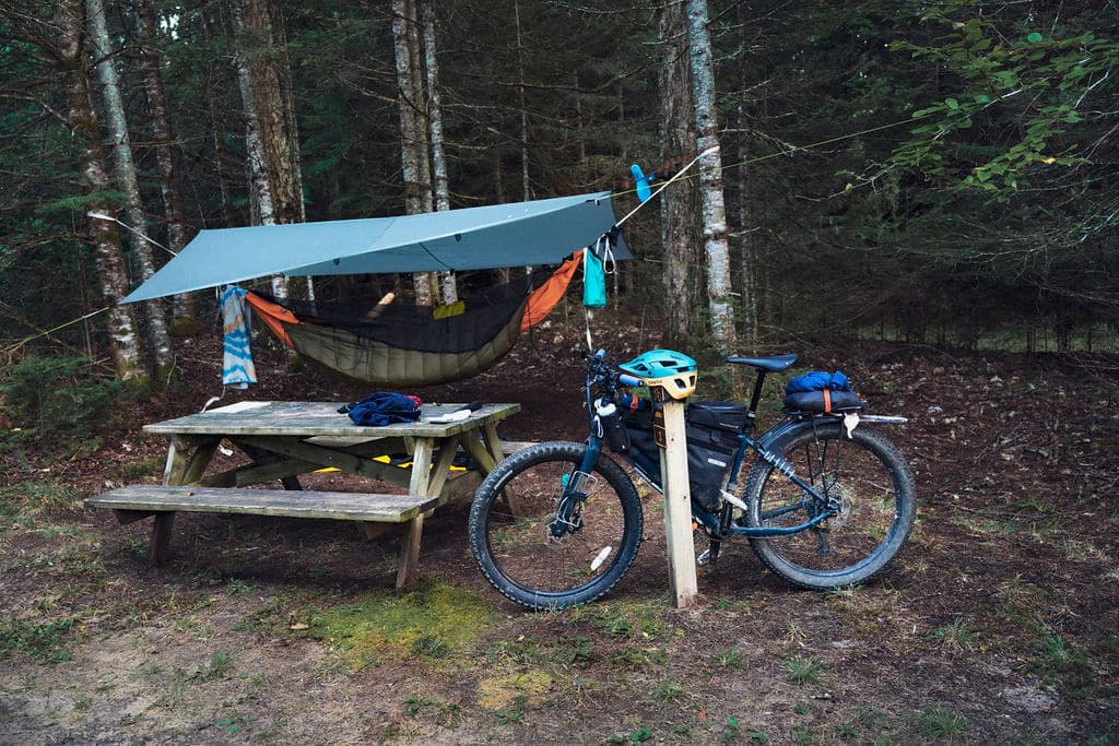The tent is often a particular challenge. Most of the time, it is placed in the handlebar bag, if the bike has flat handlebars (mountain bike type), or in the saddle bag. It can also be divided by putting the soft part in a pannier and attaching the poles to the handlebars or top tube with straps.