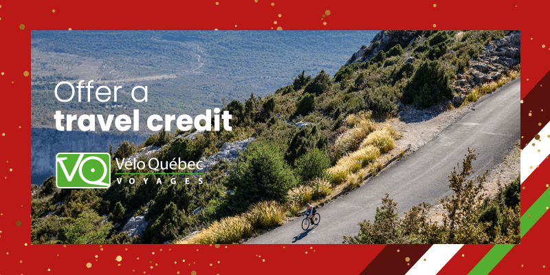 Would you like to contribute to the package of a loved one who would like to book a trip with our agency in 2026? For Christmas, give them a travel credit in the amount of your choice at Vélo Québec Voyages and contribute to their dream vacation!