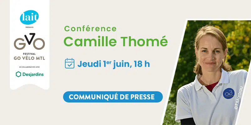 Montréal, le mercredi 31 mai 2023 – Dans le cadre du Festival Go vélo Montréal, présenté par le Lait en collaboration avec Desjardins, Vélo Québec est heureux d’accueillir Mme Camille Thomé, directrice de Vélo & Territoires, à titre de conférencière invitée. À cette occasion, elle abordera le potentiel du tourisme à vélo en tant que levier politique pour le développement du territoire, en présentant les progrès accomplis en France suite à l’instauration d’un plan national vélo en 2018. La conférence sera suivie d’une table ronde à laquelle participeront les panélistes suivants : David Lecointre, Président de l’Association des réseaux cyclables du Québec et directeur général de la Véloroute des Bleuets, Amélie Caron, Coordonnatrice, développement du cyclotourisme, Tourisme Montérégie et Frédérik Meilleur, Directrice des Opérations, Hôtel Plaza Valleyfield.